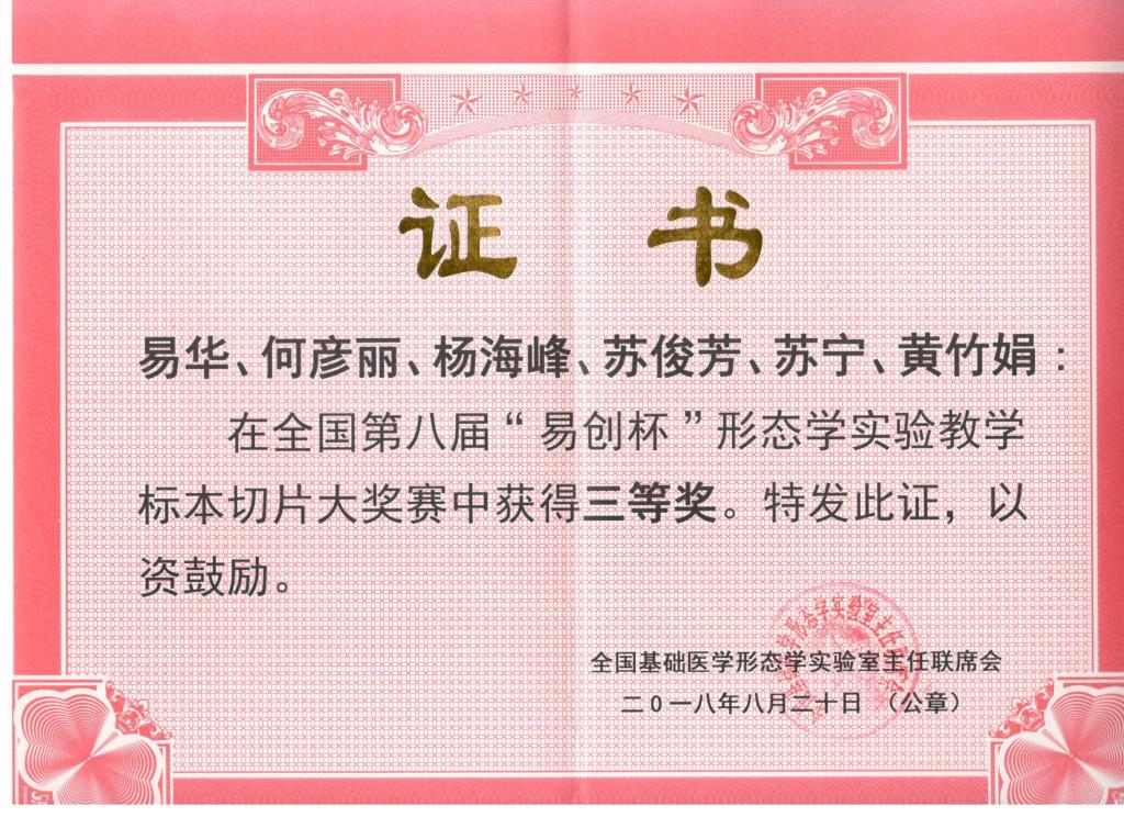 在8月20日于济南召开的“2018年高校基础医学教学研讨会暨高校基础医学形态学实验室主任联席会第十一次会议”上,由易华团队和黄竹娟团队制作的病理切片分别获得了三等奖和优秀奖。