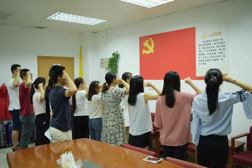 随后在公司党员活动室举行了入党宣誓仪式。由何美莹同志领读誓词,预备党员面向党旗宣誓,老党员重温入党誓词。他们声音洪亮、庄重严肃的向党表明心迹,激昂奋进的誓言久久回荡在会议室内。